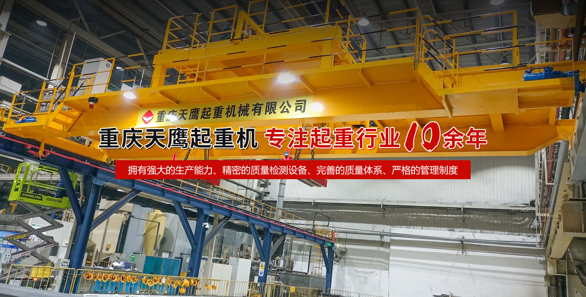 重慶天鷹起重機械有限公司成立于2014年,主營起重機的銷售、安裝和維護等相關服務。中國重型機械工業協會員單位、為中國工程機械工業協會工程機械維修分會會員單位及西南地區起重機械定點安裝維修單位。具有國家質量監督檢疫總局頒發的特種設備安裝維修改造質格證書。并率先通過了IS09001-2000質量體系認證。  公司注冊資金3000萬元;廠房面積2萬平方米;各種生產檢測設備50臺套,公司技術力量雄厚,聘請了國內知名起重機專家、工程技術人員擔當項目經理、技術總工程師及顧問。現擁有員工100多人,其中工程技術人員12人。  主導產品為各類橋、門式起重機及輕小型起重設備,具備生產起重量200t及以下通用橋、門式起重機的能力,尤其在200t以下起重機產品上具備較強的市場競爭力,為許多行業設計制造了技術含量高、技術性強的起重設備,許多產品在原設計標準上進行了較大的改進、優化和創新;其中NH型系列電動葫蘆、HD型電動單梁處于國內高水平.....  好的產品品質需要由較高的裝備水平來保證,公司購買了“大型數控落地鏜”、“數控切割機床”、“自調式焊接滾輪機”、“數顯液壓板料折彎機”、“超大型數控臥式車床”、“數控液壓水平下調式三輥卷板機”、“單柱移動式立式車床”“擁有用于單梁生產的全國一條拋丸噴漆烘干線、葫蘆噴漆烘干線和全國較大的100T葫蘆試驗臺和檢測中心”等各種先進的加工設備,新建廠房面積近2萬平方米。  質量是企業的生命,天鷹公司依據“ISO 9001國際質量管理體系”標準,制定并完善了公司的質量管理體制。堅持質量體系的內審和外審,將質量管理工作落實到企業生產經營的全過程。  您的微笑,是天鷹永恒的追求;天鷹的服務,是您首要的選擇!因為我們堅信:“誠信是本、質量鑄就品牌”。為您服務是我們的榮耀,勤奮而進取的天鷹人,時刻期盼著您的到來。
